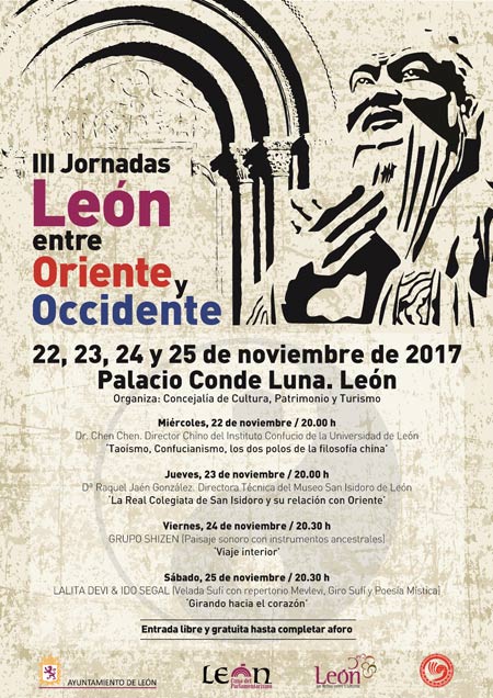 Las III Jornadas «León entre Oriente y Occidente» mostrarán en esta nueva edición distintas expresiones culturales, artísticas y musicales de la cultura oriental y su influencia en el antiguo Reino de León. Comienzan este miércoles 22 de noviembre y se prolongarán hasta el sábado día 25, en el Palacio del Conde Luna, con entrada gratuita. Contarán con la participación del director chino del Instituto Confucio de León, Chen Chen, y la directora del Museo de San Isidoro, Raquel Jaén, quienes presentarán sendas ponencias, y con las actuaciones del Grupo Shizen y de Lalita Devi & Ido Segal.