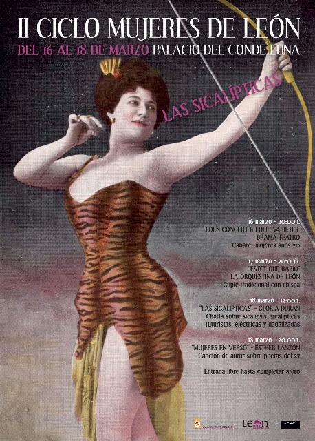 El Palacio del Conde Luna acoge del 16 al 18 de marzo el II Ciclo de Mujeres de León “Las Mujeres Sicalípticas y del Cuplé”, organizado por la Concejalía de Igualdad del Ayuntamiento de León. En esta nueva edición el ciclo incluye varios espectáculos músico teatrales y una charla conferencia que acerca a estas mujeres que cambiaron los roles y asentaron las bases del feminismo. Los días 16 y 17 de marzo será a las 20:00 horas y el 18 de marzo a las 12:00 horas y 20:00 horas.