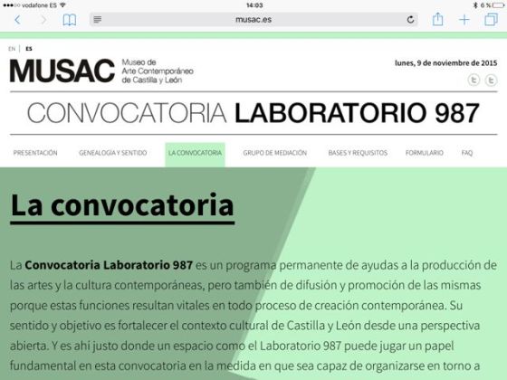 El MUSAC presenta, este 11 de noviembre, la Convocatoria Laboratorio 987 de ayudas a la producción y difusión de la creación y la cultura contemporáneas. Se trata de un programa abierto y permanente en el tiempo, con el que se pretende asumir el reto de que se produzcan, desde el espacio del museo llamado Laboratorio 987, las condiciones idóneas para promover tanto la producción como la difusión de la creación y la cultura contemporáneas, así como la experimentación de otros modos de relación entre la institución y la comunidad artística y su inserción en la sociedad.