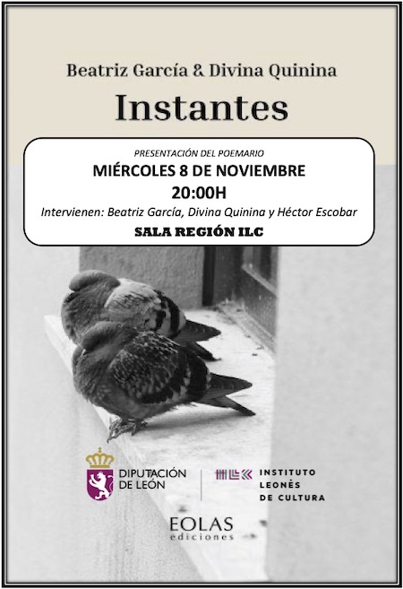 Este miércoles 8 de noviembre, a las ocho de la tarde, en la Sala Región del Instituto Leonés de Cultura, tendrá lugar la presentación del poemario “Instantes”, del que son autoras Beatriz García (poemas) y Divina Quinina (fotografías). El libro ha sido publicado por Eolas ediciones dentro de la colección Seinne.