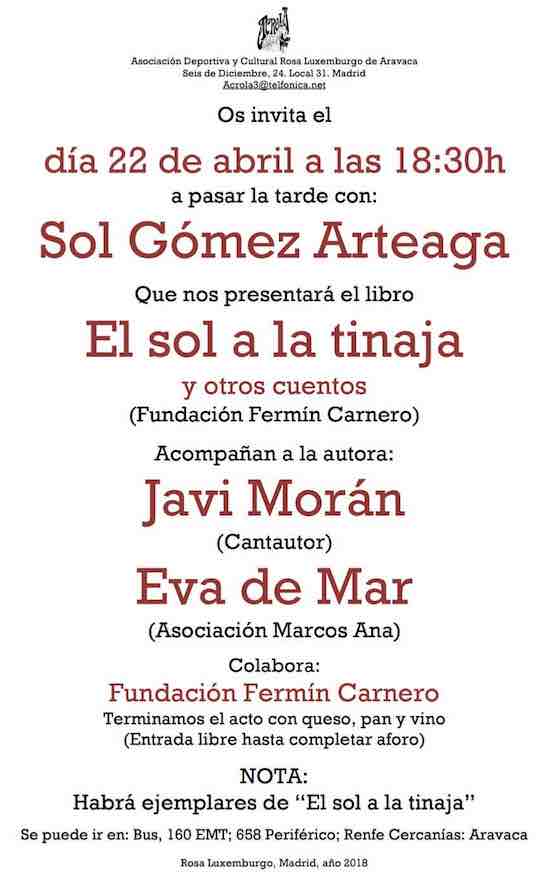 El domingo 22 de abril de 2018 tendrá lugar a las 18’30 horas, en la Asociación Rosa de Luxemburgo (Acrola) de Aravaca (Madrid), la presentación del libro «El Sol a la tinaja y otros cuentos» de Sol Gómez Arteaga, editado por la Fundación Fermín Carnero. Acompañarán a la autora en su presentación Alfonso Sobrino Aparicio (Presidente de Acrola), Eva de Mar (Asociación Marcos Ana) y Javi Morán (cantautor).