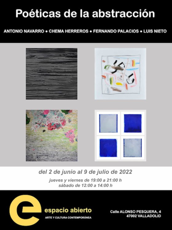 «Poéticas de la abstracción», la exposición que se presenta este mes de junio en Espacio Abierto (Valladolid), tiene como objetivo investigar y reflexionar sobre los valores de cuatro artistas actuales que transcurren por “los caminos de la abstracción”, pero también realizar un análisis de las estructuras, los elementos expresivos por los que discurren y sus planteamientos creativos. Estos cuatro creadores son: Antonio Navarro, Chema Herreros, Fernando Palacios y Luis Nieto.