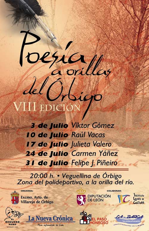 Víktor Gómez, Raúl Vacas, Julieta Valero, Carmen Yáñez y Felipe J. Piñeiro. Son los cinco poetas que irán desfilando, cada viernes del mes de julio, por la localidad leonesa de Veguellina de Órbigo para recitar junto al río a las ocho de la tarde.