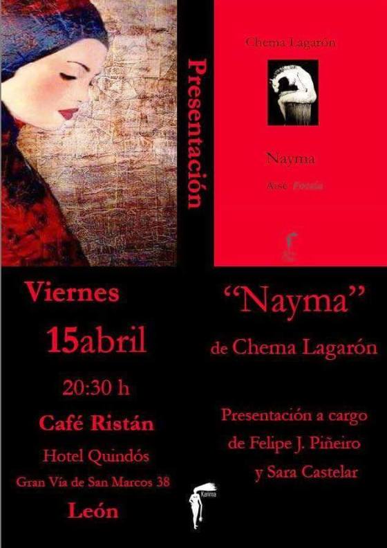 El Café Ristán (espacio cultural del Hotel Quindós, en León) acoge este viernes 15 de abril, a las 20,30, la presentación del poemario »Nayma» (Karima Editora) de Chema Lagarón. El autor estará acompañado por Felipe J.Piñeiro y Sara Castelar.