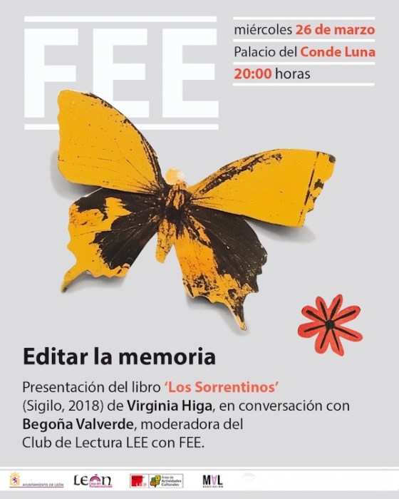 Este miércoles 26 de marzo, a las 20 horas en el Palacio de Conde Luna de León, tendrá lugar un encuentro con la escritora argentina Virginia Higa a propósito de su libro “Los sorrentinos”. La autora estará acompañada por Begoña Valverde (coordinadora del Club de lectura LEE con FEE), dentro del ciclo Editar la memoria.