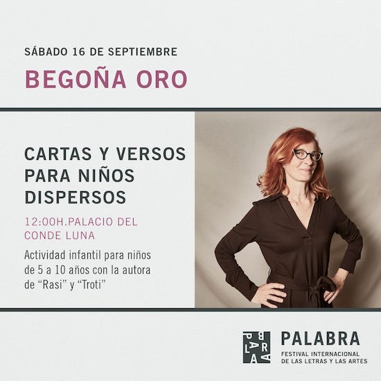 La penúltima jornada del Festival Palabra empezará a las 12 del mediodía de este sábado 16 de septiembre, con una actividad infantil a cargo de Begoña Oro. También por la mañana, a las 12,30 horas, habrá una lectura de poesía con Elsa Moreno, Hugo Martín Isabel y Marina Gay. Y, por la tarde, la propuesta es un encuentro con las escritoras María Zaragoza y Patricia Esteban Erlés.