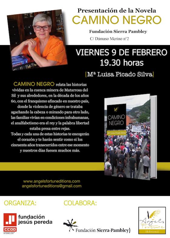 La Fundación Sierra Pambley de León acogerá el viernes 9 de febrero, a las 19.30 horas, la presentación de la novela “Camino negro”, de María Luisa Picado Silva. El acto está organizado por la Fundación Jesús Pereda de CCOO de Castilla y León, junto a CCOO de León y Angels Fortune Editions. Intervendrán en la presentación, además de la autora, Ignacio Fernández Herrero, presidente de la Fundación Jesús Pereda de CCOO de Castilla y León, e Isabel Montes, editora del libro.
