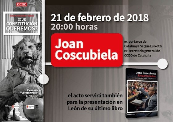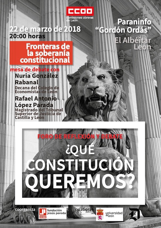 CCOO de León y la Fundación Jesús Pereda ponen en marcha el foro de reflexión y debate “¿Qué Constitución queremos?”. Este amplio programa, que se desarrollara en León desde el presente mes de febrero hasta el próximo mes de junio, se inicia con la intervención este miércoles, 21 de febrero (20 horas), del político catalán Joan Coscubiela. El acto tendrá lugar en el Paraninfo “Gordón Ordás” del Pabellón Albéitar de la Universidad de León.