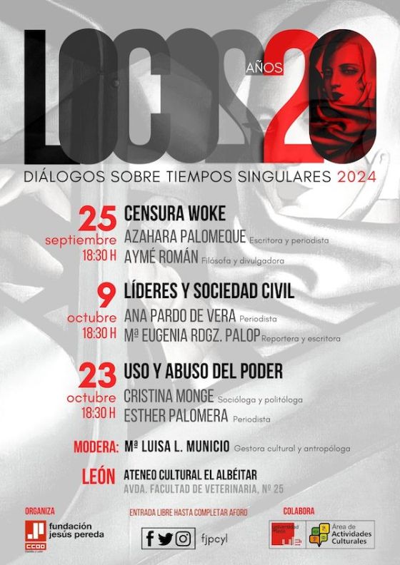 La Fundación Jesús Pereda de CCOO de Castilla y León y CCOO presentaron este viernes 20 de septiembre la tercera edición del programa “Locos años 20”, una serie de diálogos sobre tiempos singulares que se llevará a cabo durante los meses de septiembre y octubre en el Ateneo Cultural El Albéitar, en León. Arrancarán el próximo miércoles 25 de septiembre, a las 18:30 horas, con Azahara Palomeque y Aymé Román, quienes conversarán sobre la «censura woke».