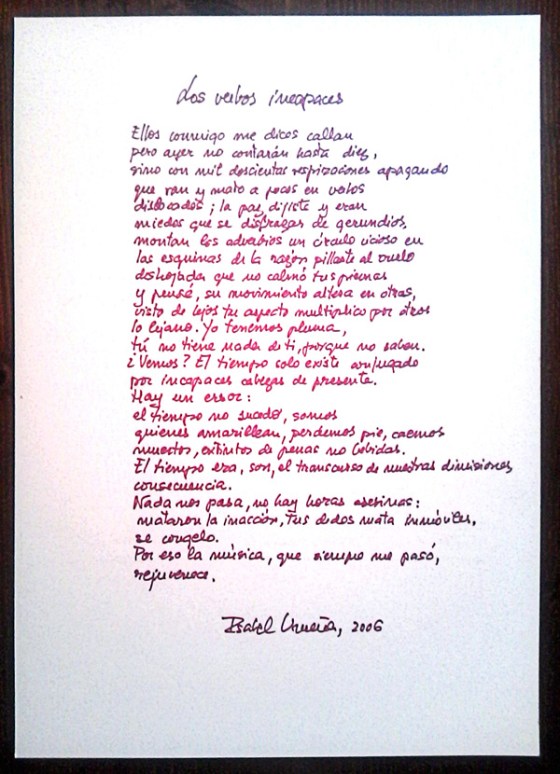 Publicamos un poema inédito de la compositora, directora de orquesta, música y escritora Isabel Urueña, fechado en 2006 y reproducido hace algunos años en el desaparecido blog Isla Kokotero, y que forma parte —en su versión manuscrita por la autora— de la exposición Diálogo e intersecciones entre poesía y artes plásticas, que se puede visitar hasta el 31 de enero de 2015 en el Museo de la Harina de Gordoncillo (León).