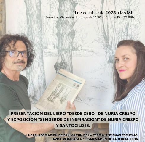 Palabra e imagen se unen este sábado 11 de octubre en San Martín de la Tercia (León) con la presentación del libro “Desde cero” de Nuria Crespo y la exposición “Senderos de Inspiración” de José Antonio Santocildes. El encuentro, organizado por la Asociación Cultural de la localidad, tendrá lugar en las antiguas escuelas (Avda. Peñalaza nº 1), a las 18:00 horas. La entrada es libre hasta completar el aforo.