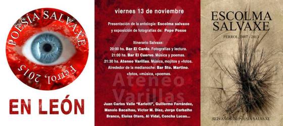 Ocho poetas de Galicia y León participarán el viernes 13 de noviembre en una ronda poética por distintos bares y espacios de la capital leonesa. Se presentará la antología «Escolma Salvaxe», en la que se incluyen textos y poemas de medio centenar de autores que, en los últimos años, han pasado por la Semana Salvaxe que se organiza desde 2007 en Ferrol. Habrá también buena música y una exposición de fotografías.