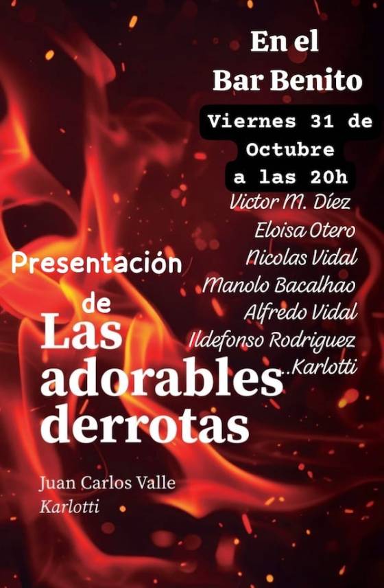 El histórico bar Benito, en la Plaza Mayor de León, acogerá este viernes 31 de octubre, a las 20 horas, la presentación de «Las adorables derrotas», el último poemario de Juan Carlos Valle, alias Karlotti, uno de los principales promotores de la Semana da Poesía Salvaxe de Ferrol. El autor estará acompañado por algunos amigos leoneses y gallegos, músicos y poetas como Alfredo Vidal, Ildefonso Rodríguez, Manolo Bacalhao, Nicolás Vidal, Víctor M. Díez y Eloísa Otero.