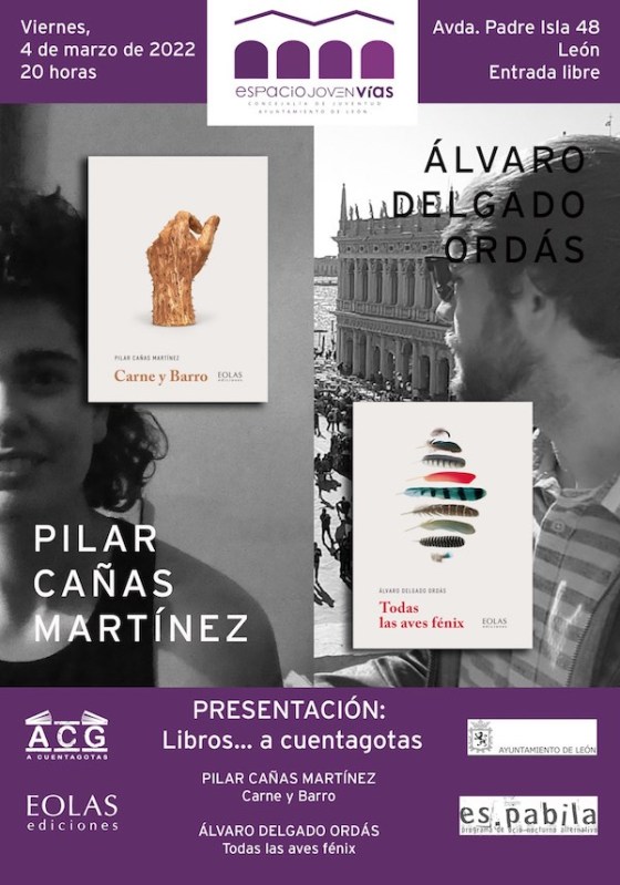 Este viernes 4 de marzo, a las ocho de la tarde en Espacio Vías, se presentan los libros «Todas las aves fénix», de Álvaro Delgado Ordás, y «Carne y Barro», de Pilar Cañas Martínez.