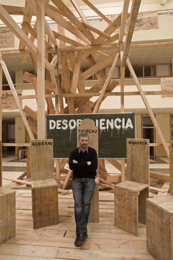 Por CAMINO SAYAGO.— El artista multidisciplinar Jesús Palmero vuelve a intervenir el Hall de la Facultad de Filosofía y Letras de la Universidad de León con su último proyecto, ‘Cimientos volubles. La revolución se empieza por el tejado’. Una instalación con un discurso centrado en la idea del desmantelamiento del Estado, que forma parte del ciclo expositivo’El Hall Transformado’ iniciado por el crítico Javier Hernando Carrasco en 1993. Nos lo cuenta en esta primera entrevista con Tam Tam Press.
