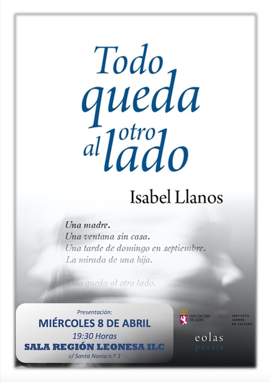 La Sala Región del Instituto Leonés de Cultura (ILC) acoge este miércoles 8 de abril, a las 19.30 horas, la presentación del poemario “Todo queda al otro lado” (Eolas Ediciones), de la actriz y poeta Isabel Llanos, quien estará acompañada por la periodista Ana Gaitero. Y al día siguiente, jueves 9 de abril, será Antonio Colinas quien la acompañe en la presentación que tendrá lugar en la Casa de la Poesía de La Bañeza.