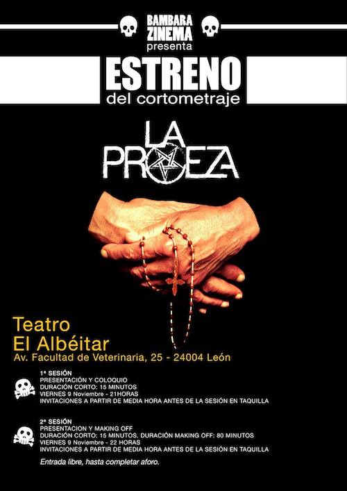 El Teatro El Albéitar (ULE) acoge este viernes 9 de noviembre el estreno en León de «La proeza», un cortometraje que galopa entre lo fantástico y el terror, escrito y dirigido por Isaac Berrokal y producido por Bambara Zinema (Isabel Medarde), con un elenco exclusivo de mujeres en el que participan más de 15 actrices, casi todas leonesas. Habrá dos pases, a las 21 y a las 22 horas, con entrada gratuita hasta completar el aforo (las invitaciones se podrán recoger a partir de media hora antes de cada sesión).