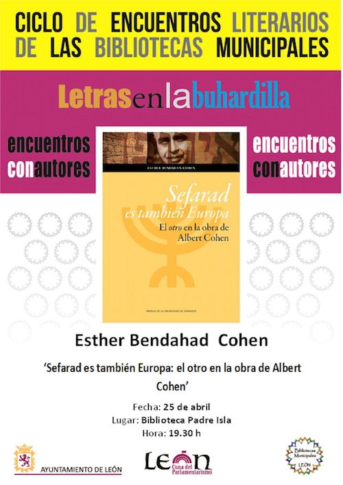 La filóloga y novelista Esther Bendahan Cohen llega este martes, 25 de abril, al ciclo «Letras en la buhardilla» que organizan las Bibliotecas Municipales de León, para charlar en torno a su última obra, «Sefarad también es Europa. El ‘otro’ en la obra de Albert Cohen». Será a partir de las 19.30 horas, en la Biblioteca Padre Isla. Entrada libre.
