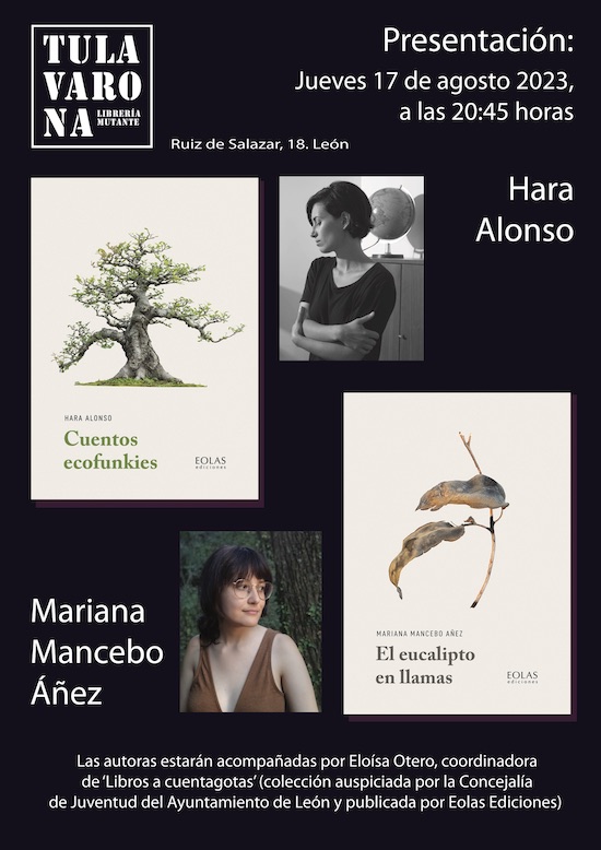 Dos jóvenes y polifacéticas creadoras leonesas, la compositora y artista sonora Hara Alonso y la traductora y poeta Mariana Mancebo Áñez, presentarán sus obras de debut en la literatura —Cuentos ecofunkies la primera y El eucalipto en llamas la segunda— el próximo jueves 17 de agosto, a las 20:45 horas, en la librería mutante Tula Varona (calle Ruiz de Salazar 18, León). Las autoras estarán acompañadas por Eloísa Otero, coordinadora de la colección ‘Libros a cuentagotas’.