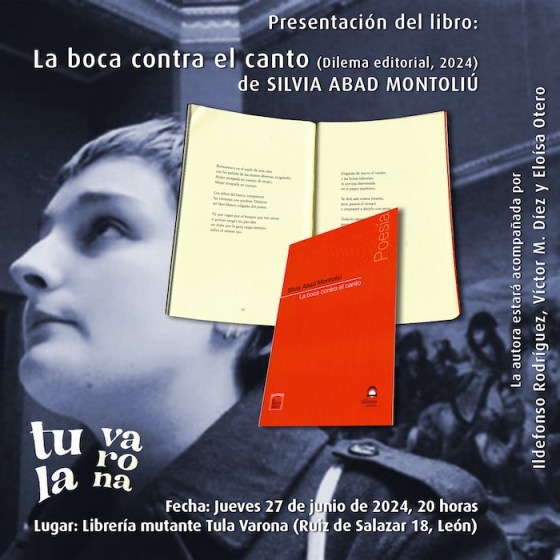 Silvia Abad Montoliú, poeta leonesa afincada en Francia, presentará en la librería mutante Tula Varona su tercer poemario, ‘La boca contra el canto’ (Dilema Editorial, 2024), este jueves 27 de junio de 2024, a las 20 horas. La autora estará acompañada por Ildefonso Rodríguez, Víctor M. Díez y Eloísa Otero. Entrada libre.