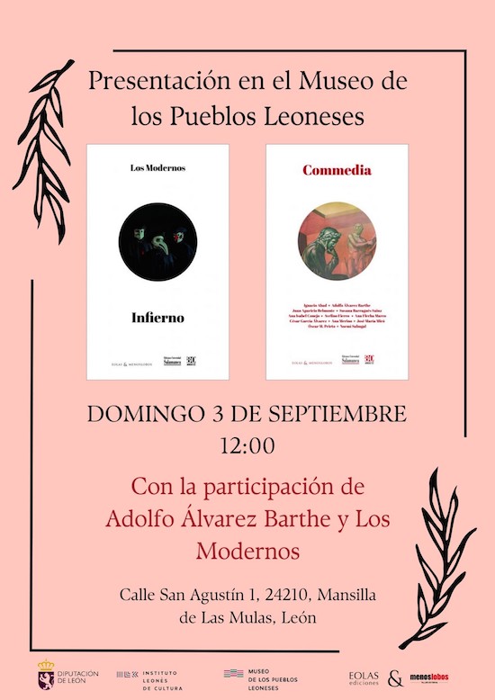 El Museo de los Pueblos Leoneses (en Mansilla de las Mulas) acoge este domingo 3 de septiembre, a las 12 horas, la presentación del disco-libro ‘Commedia-Infierno’, con música del grupo Los Modernos y textos de nueve autores leoneses. En el acto intervendrán el pintor Adolfo Álvarez Barthe, autor de las ilustraciones del libro, y tres componentes del grupo: Maximiliano Martínez de Paz, Jorge Escobar y Héctor Escobar.
