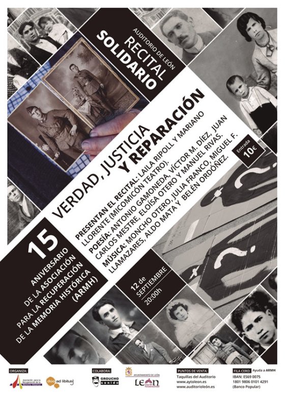 El Auditorio de León acogerá el 12 de septiembre un recital solidario con motivo del 15 aniversario de la Asociación para la Recuperación de la Memoria Histórica (ARMH). Participarán los poetas Antonio Gamoneda, Víctor M. Díez, Juan Carlos Mestre y Eloísa Otero. Y tocarán los músicos Moncho Otero, Julia Franco, Miguel F. Llamazares, Aldo Mata y Belén Ordóñez. Veinte horas antes del recital, en la medianoche del viernes al sábado, el artista Luis Melón iniciará una performance reivindicativa, abierta a la participación del público, en la Plaza de San Marcos.