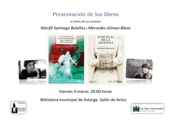 Las escritoras Marifé Santiago Bolaños y Mercedes Gómez-Blesa presentan el próximo viernes 4 de marzo en Astorga los libros “La violencia es una veta miserable que cubrimos con canciones” y “Estéticas de la ausencia”. Ambos forman parte de la colección «Palabras hilanderas» de la Editorial Huso. Será a las 20:00 horas, en el Salón de Actos de la Biblioteca Municipall.
