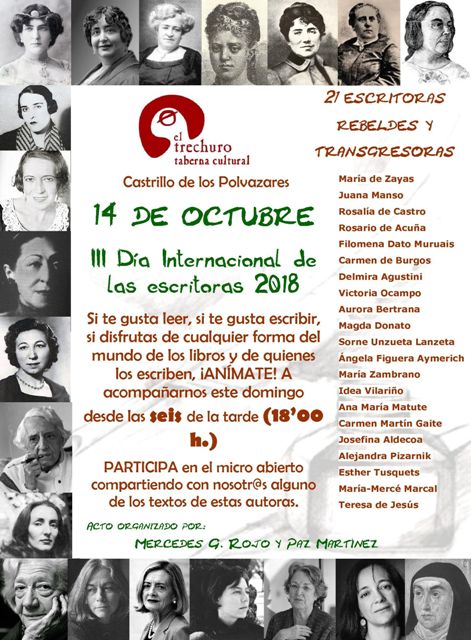 La Taberna cultural ‘El Trechuro’ de Castrillo de los Polvazares (León), será este domingo 14 de octubre el lugar elegido para celebrar la tercera edición del Día Internacional de las Escritoras. Una propuesta que bajo el título ‘Rebeldes y trangresoras’ pretende recuperar su legado y hacerlo visible, y a la que se suman este año dos escritoras de la zona: Mercedes Rojo y Paz Martínez. A partir de las 18:00 horas dará comienzo una lectura abierta de textos de 21 escritoras.