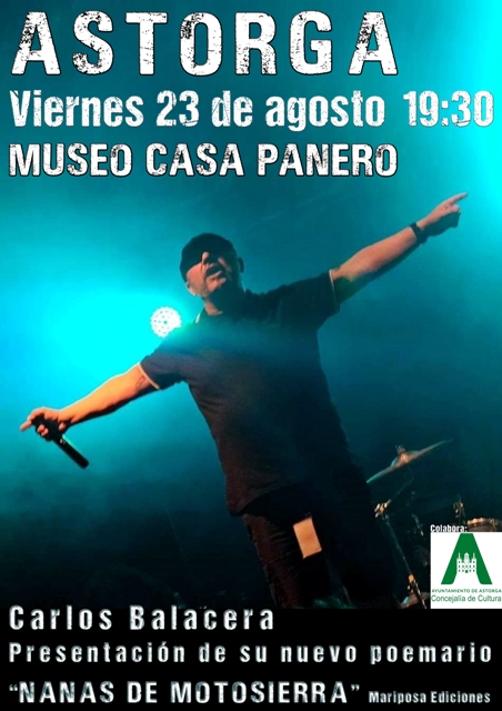 El músico y poeta maragato afincado en León Carlos Balacera presenta en el Museo Casa Panero de Astorga su nuevo poemario «Nanas de motosierra», un trabajo intimista plagado de nostalgia. Será este viernes 23 de agosto, en le patio del museo, a partir de las 19:30 horas.