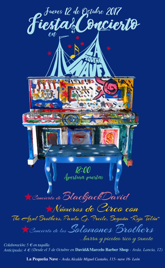 La Escuela de Circo de León “La Pequeña Nave” se llena de música y circo para celebrar el inicio de curso. El evento tendrá lugar este jueves 12 de octubre en horario de tarde: desde las 18:45 (con apertura de puertas a las 18 horas). Habrá números de circo, humor y malabares con The Azul Brothers, telas aéreas con Begoña (Rojo Telón), música en directo con BlackJackDavid y Los Solomones, bailoteo, barra y picoteo rico y sanote, buen ambiente… La cuota de colaboración con el espacio es de 5€ en taquilla y 4€ anticipada.
