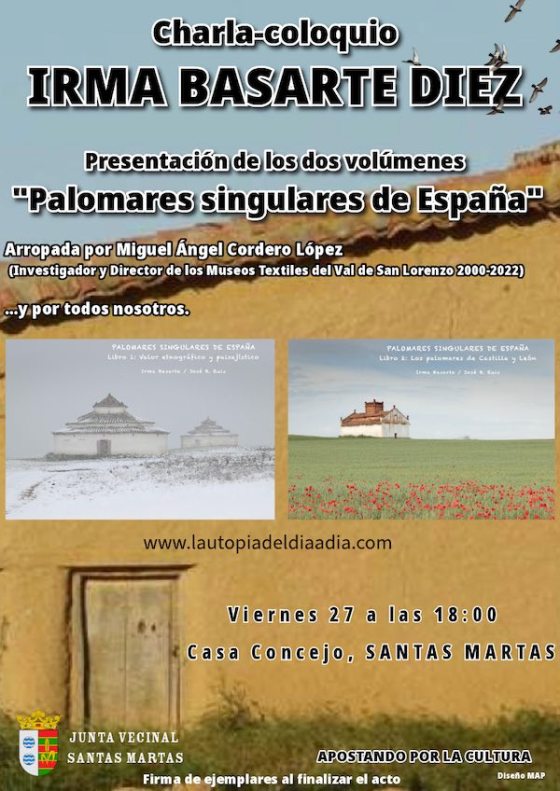 Este viernes 27 de diciembre, a las seis de la tarde, la Casa de Concejo de la localidad leonesa de Santas Martas acogerá una charla-coloquio sobre «Palomares singulares de España» a cargo de Irma Basarte.
