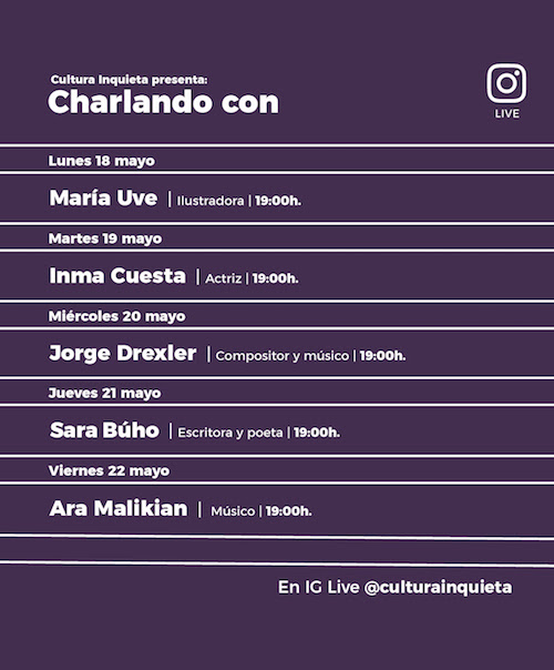 La plataforma ‘Cultura Inquieta’ continúa con su programa de conversaciones diarias con personajes del mundo de la cultura y el arte. Esta semana, del 18 al 22 de mayo, conversarán con la ilustradora María Uve, la actriz Inma Cuesta, el compositor y músico uruguayo Jorge Drexler, la escritora y poeta Sara Búho y el violinista libanés Ara Malikian. / #QUÉDATEENCASA