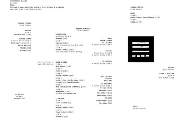Programa completo del TESLA. Festival de experimentación sonora en tres jornadas y un epílogo que se celebra en León los días 19, 20, 21 y 22 de febrero de 2016.