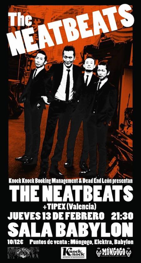 Este jueves 13 de febrero, a las 21:30 horas, en la sala leonesa Babylon (Barrio Húmedo) arrancará un doble concierto de twist, beat y punk-rock, con los japoneses The Neatbeas y los valencianos Tipex. Tan especial velada ha sido organizada por el colectivo Dead End León y Knock Knock, con entradas a 10€ anticipada y 12€ en taquilla.