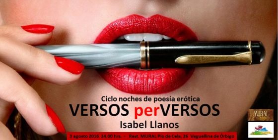 La actriz y poeta leonesa Isabel Llanos escenificará el miércoles día 3 de agosto, a medianoche, «VERSOS perVERSOS», un espectáculo de poesía teatralizada en el restaurante Mural de Veguellina de Órbigo (León), coincidiendo con el inicio de la 3ª Edición del Festival Luna de Cortos. El recital forma parte del «Ciclo de poesía erótica» que organiza la concejalía de Cultura de Villarejo de Órbigo.